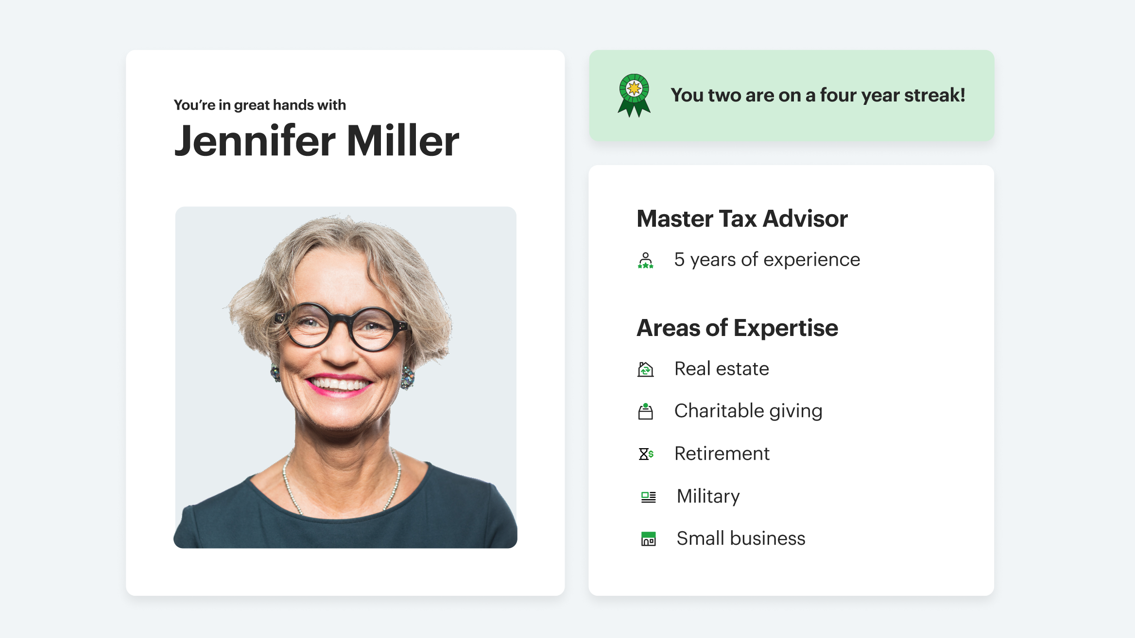 Toward the beginning of the flow, we wanted to take a moment to reinforce the tax pro’s expertise and the relationship between the client and the tax pro. Messaging on the right highlights the tax pro’s specialties and also calls out how long the pair have been working together.